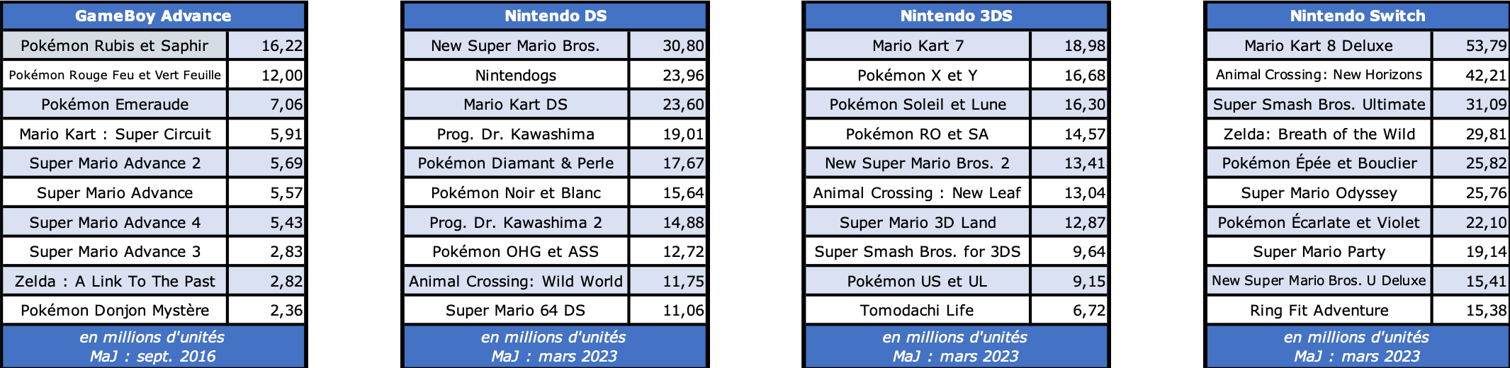 Représentation des licences Nintendo sur GBA – DS – 3DS & Switch – mars 2023